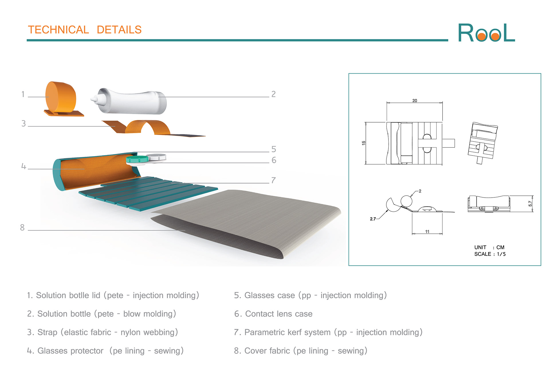 In daily life nearly half of the population wear glasses or contact lenses and consciousness about eye care/health is rising. There are plenty of options if you are planning to buy a new pair of glasses and contact lens technologies are improving rapidly; yet there is a lack of attention on the area of using/carrying and maybe combining these two together. Rool tries to address these problems by its ability to pair up both options and making it easier to switch between different combinations, offering a more compact and a cleaner solution. All in one: Lens case goes through the strap and fits in the cavity of the solution bottle when folded. The last part of the kerf separates glasses case from the contact lens area. Elastic strap wraps the product and fastens by hook and loop. In bag without glasses: Solution bottle fits in the glasses’ case and contact lens case finds its place at the back of it. Carrying two glasses: If the user wants to carry extra glasses instead of contact lens equipment. S/he can simply slip the earpiece through the elastic strap and wrap it with the protective kerf. The colors of the product is carefully selected to give the feeling of eye care hygiene and dynamism. Material selections are made by taking possible areas of usage into consideration and the form is created to serve its function as a compact and easy to carry product with a friendly look. In collaboration with: İlkin Taşdelen, Doğa Atasoy